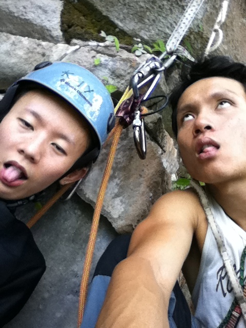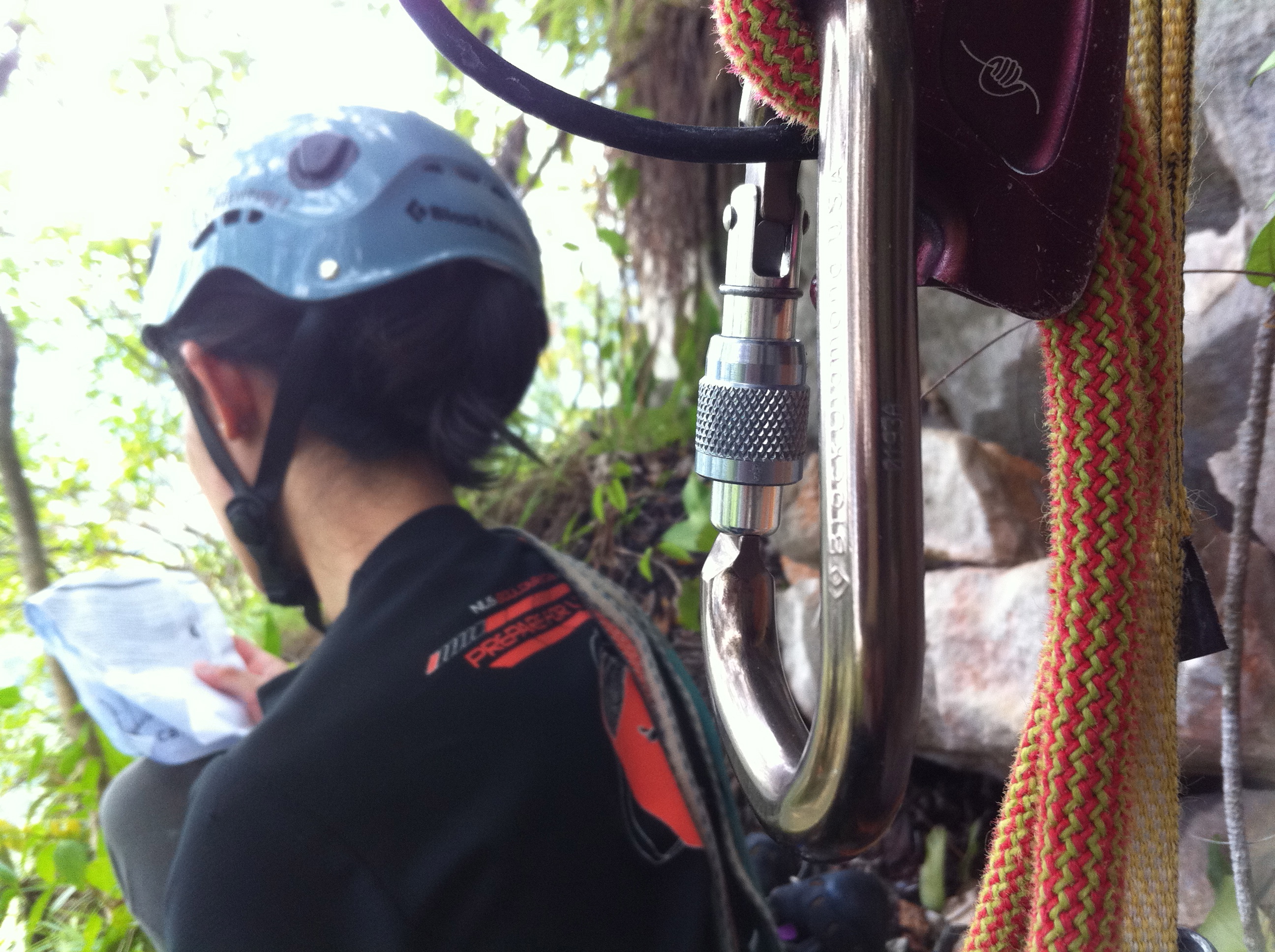 Pitch 4 was overgrown. I had no idea where to go, no bolts, no slings, no chalk mark, just lots of green. The climbing on pitch 4 was easy but not really enjoyable and the rope drag was horrible as they were rubbing against trees and plants on the way up. I arrived at a tree after about 15m-18m of climbing and saw what looked like a old rappel anchor. We decided the weather was not going to hold any more and the climbing was not really worth it although we were just one more pitch away from the top. Kelly was also having a mild heat exhaustion from the hot sun in the afternoon. We decided to descend from our high point.