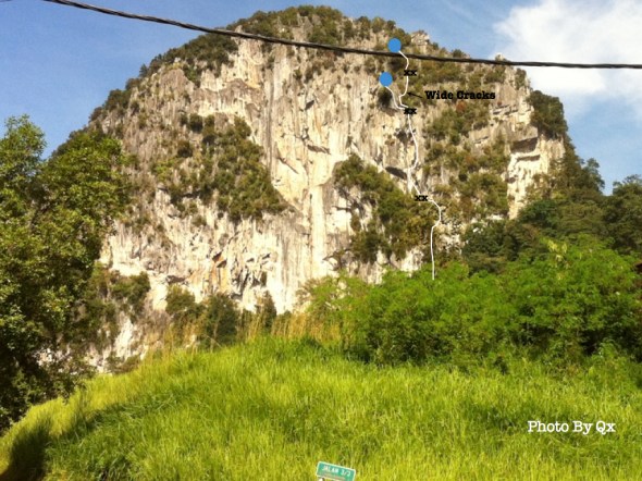 Pitch 3 is where we had the most fun. Notice the line that veer all the way left? That is where i thought was possible to climb until i pull off a rock about a football size rock and was stopped by a pile of sandy choss with lots of overgrown. I gave up and left some old tape before descending back to P2 anchor. As i was being lowered off, i saw a single bolt in the middle of the face just right of where i was. So we traverse out left from the bolted belay into air and back on to the wall and I was presented with my all time fav wide cracks.