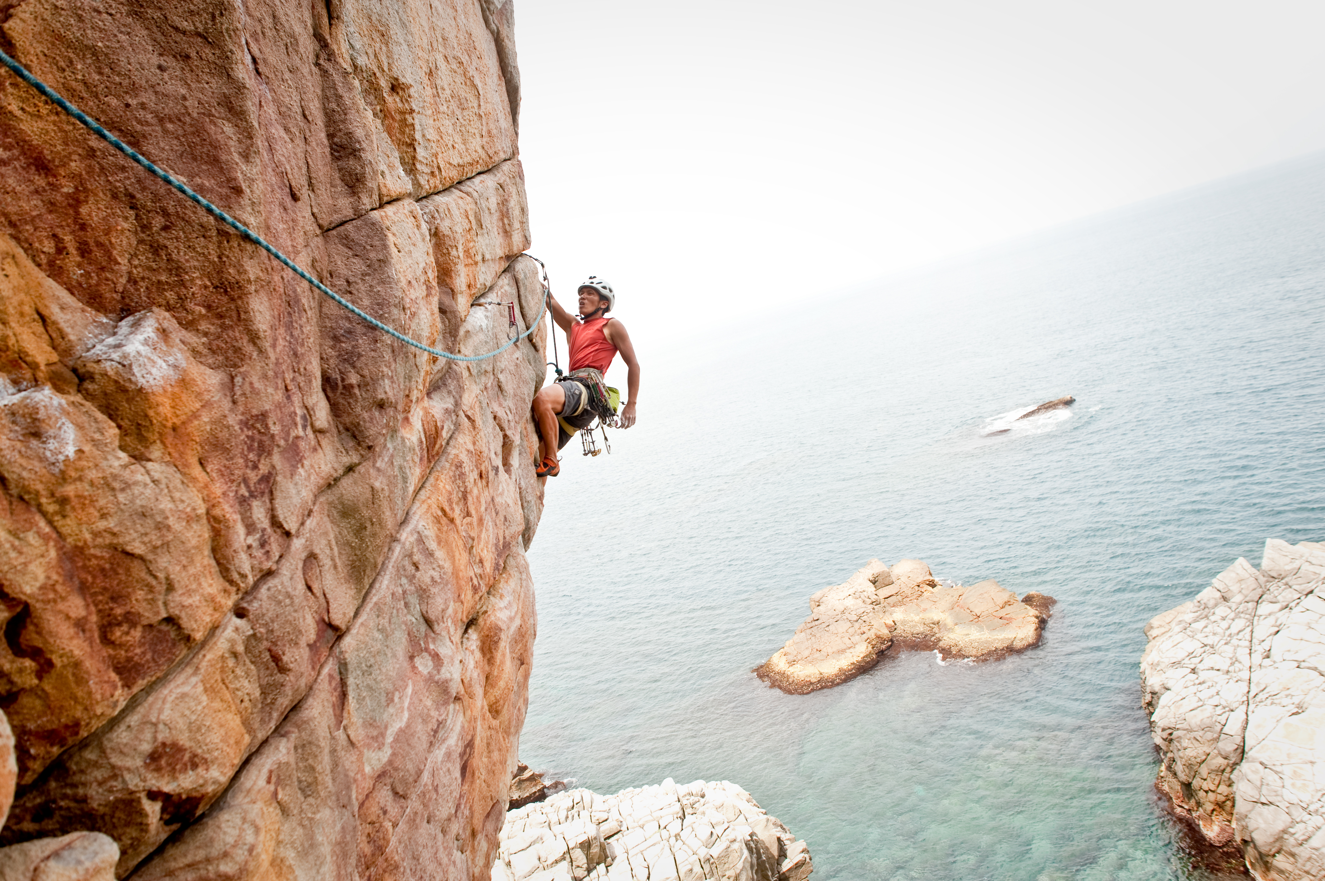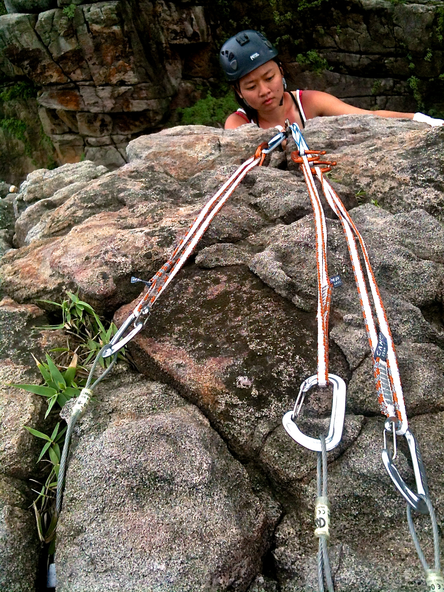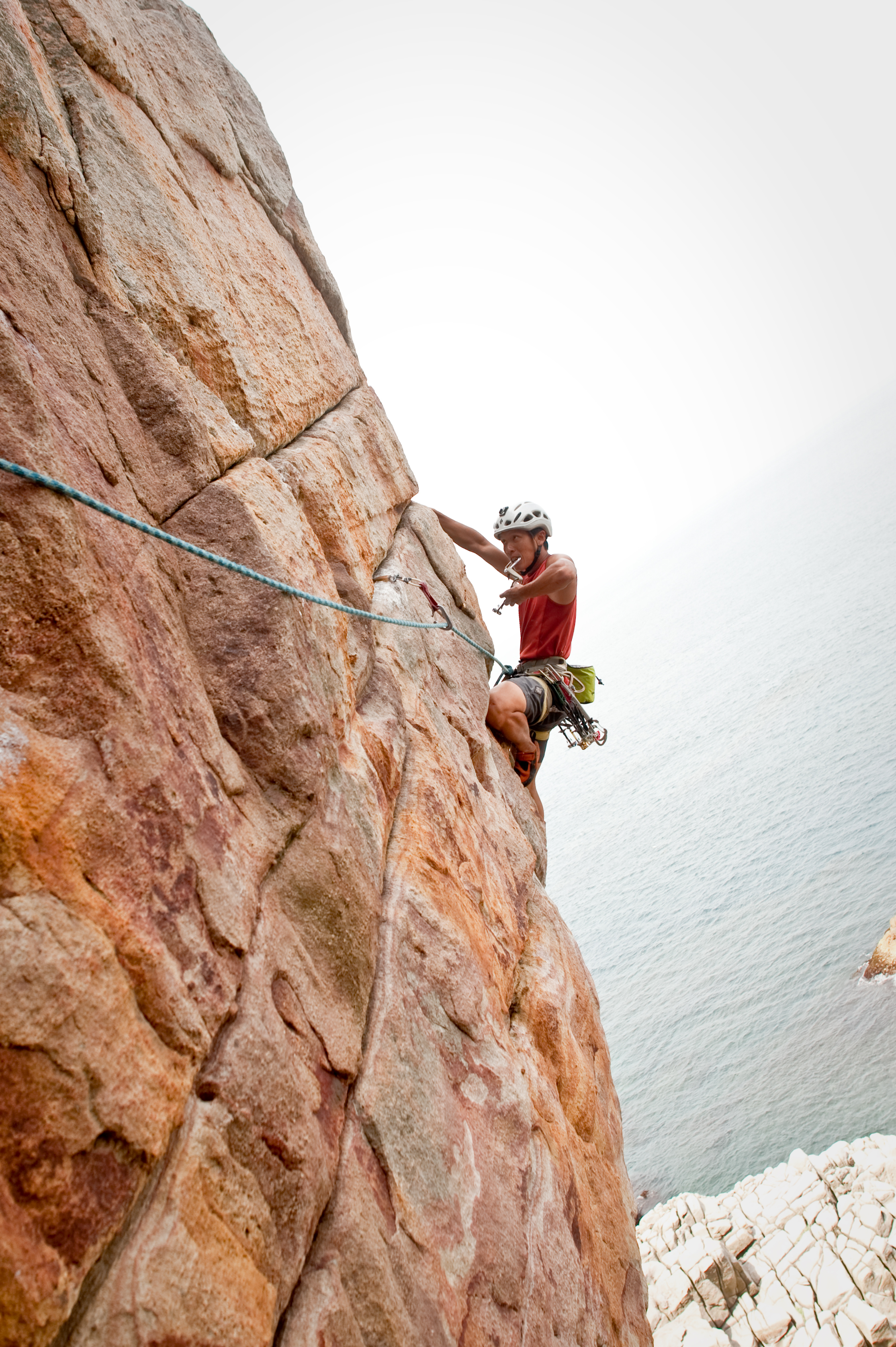 Looks a little short, but the exposure and aesthetics of the climb drew me to it. Sometimes the scarier and more beautiful things interests me and this time I took Andy and Charity with me. Charity the offical photographer haul her bags of cameras up and Andy was my belay slave. I wasn’t ballsy enough to try the route onsight as the 25m of air below me and the crashing waves somehow raise the heart rate a little. So i set a top rope and check out the gears of the route first and it turn out to be pretty small taking only Black Diamond c3 #1 and C4 #.4