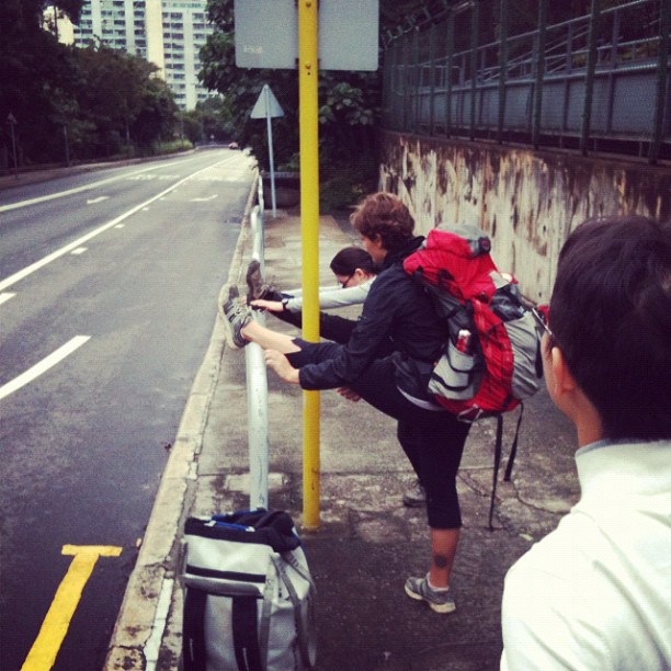 Stretching before we start walking to the crag…