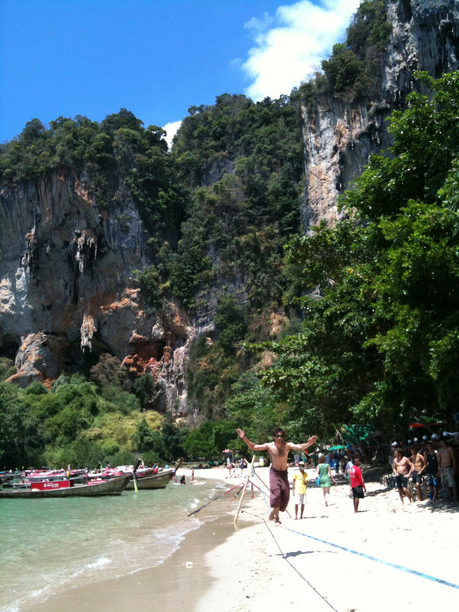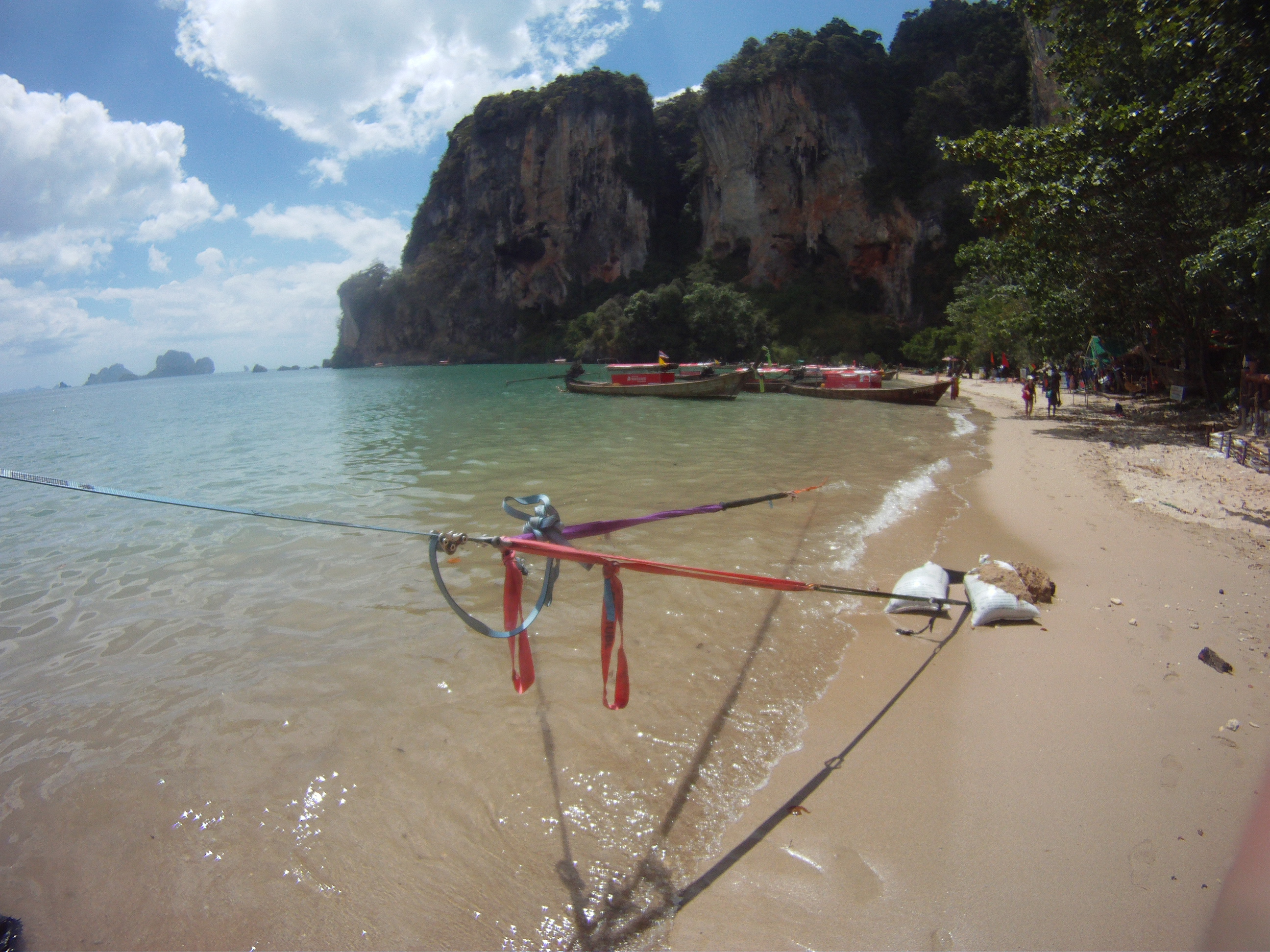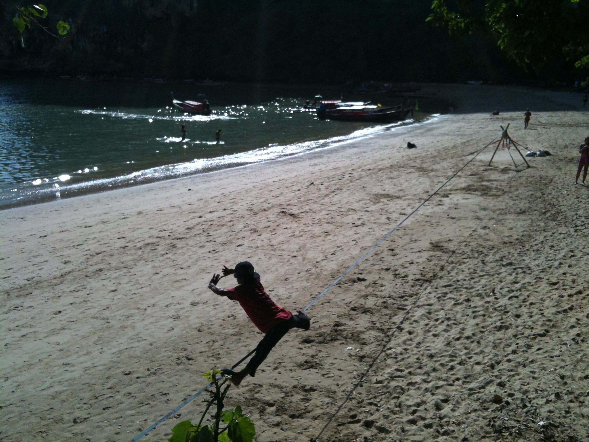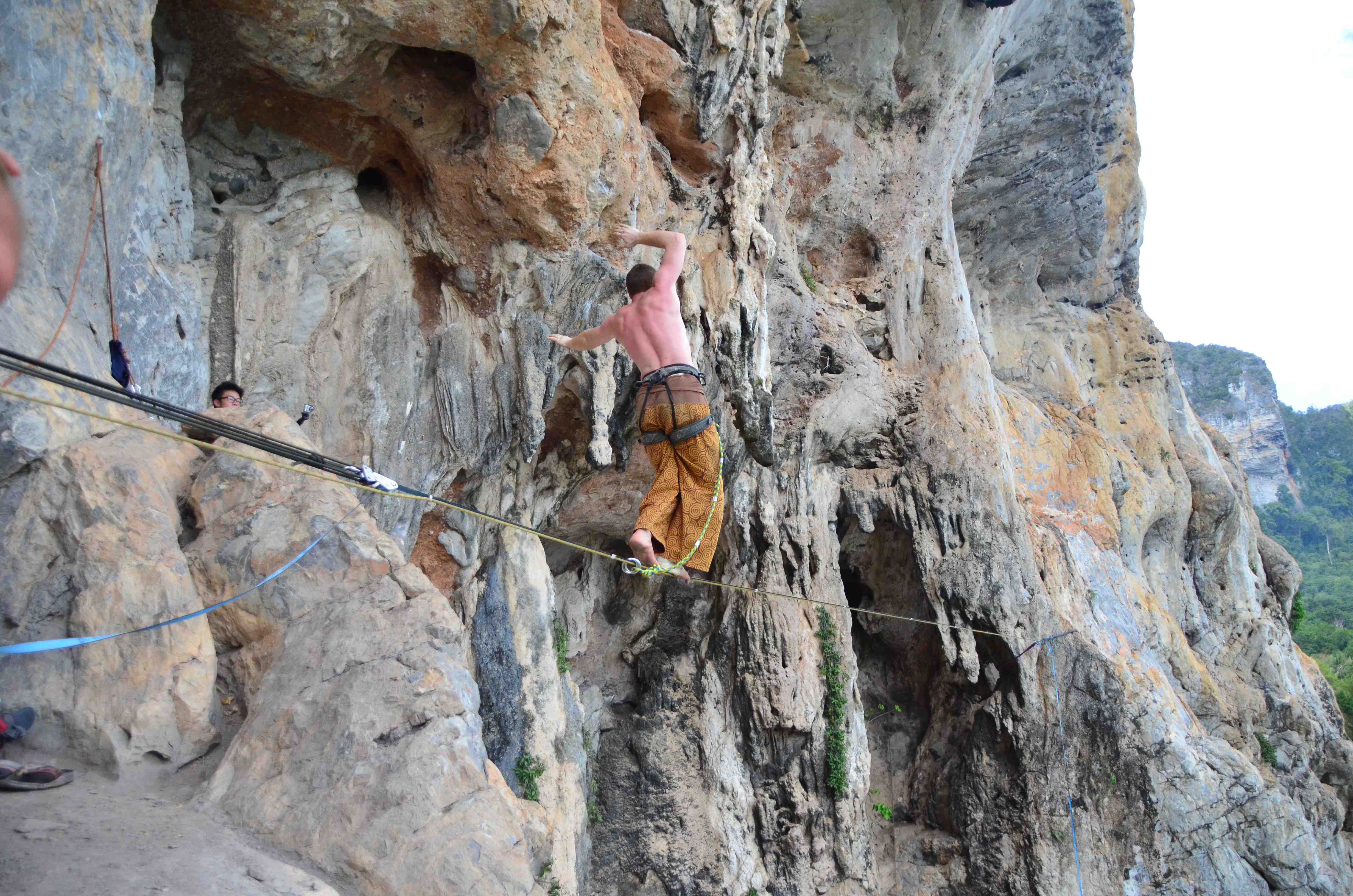 So Kelly, Fal and I landed in sunny peninsular Tonsai and the adventures starts since the first hour we stepped in, we began with slacklining in the bars with the locals and found this dude Maxi. He is high on Bong all the time and when he talks to you, he doesn’t look at you in the eye but you can’t ignore his enthusiasm. Turns out to be, he is a badass slackliner and a great Elephant supporter since every slackliner who visit will leave him something, his gears are almost as comprehensive as mine. (I left him my line lockers, slings and Elephant T-shirt)