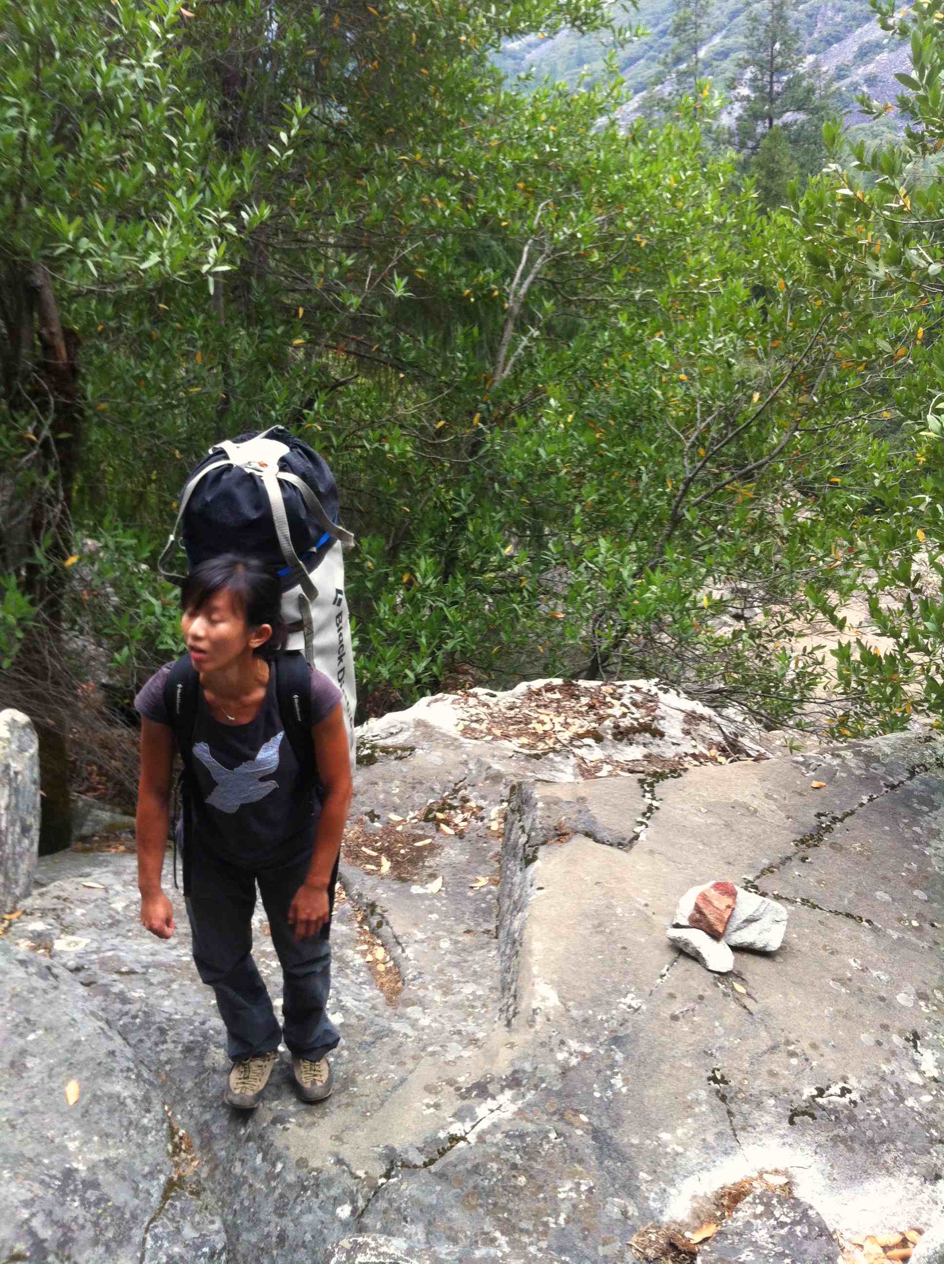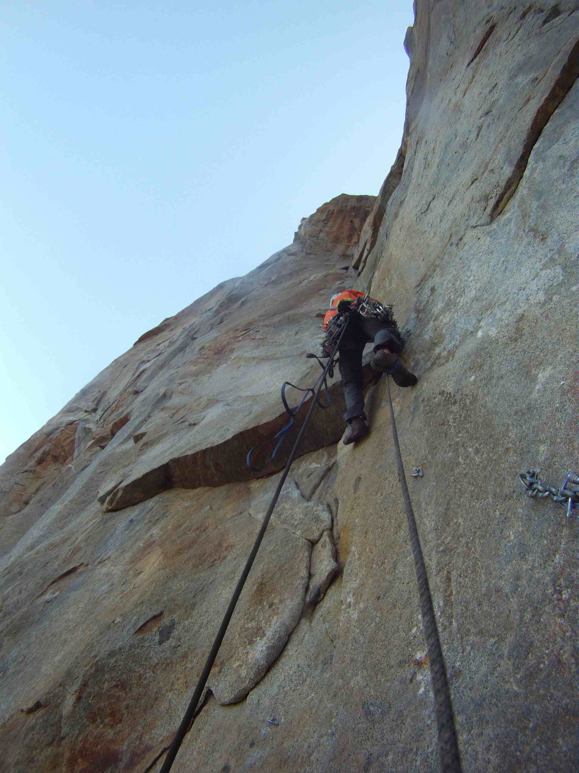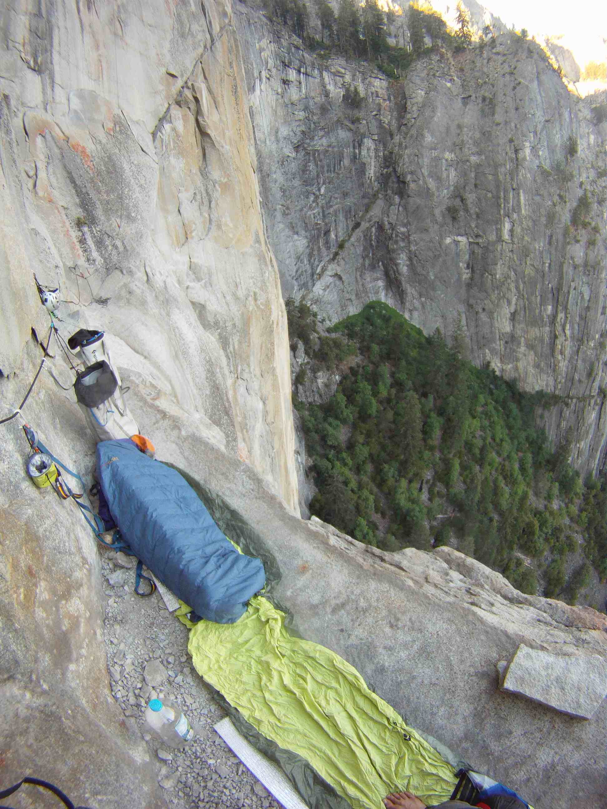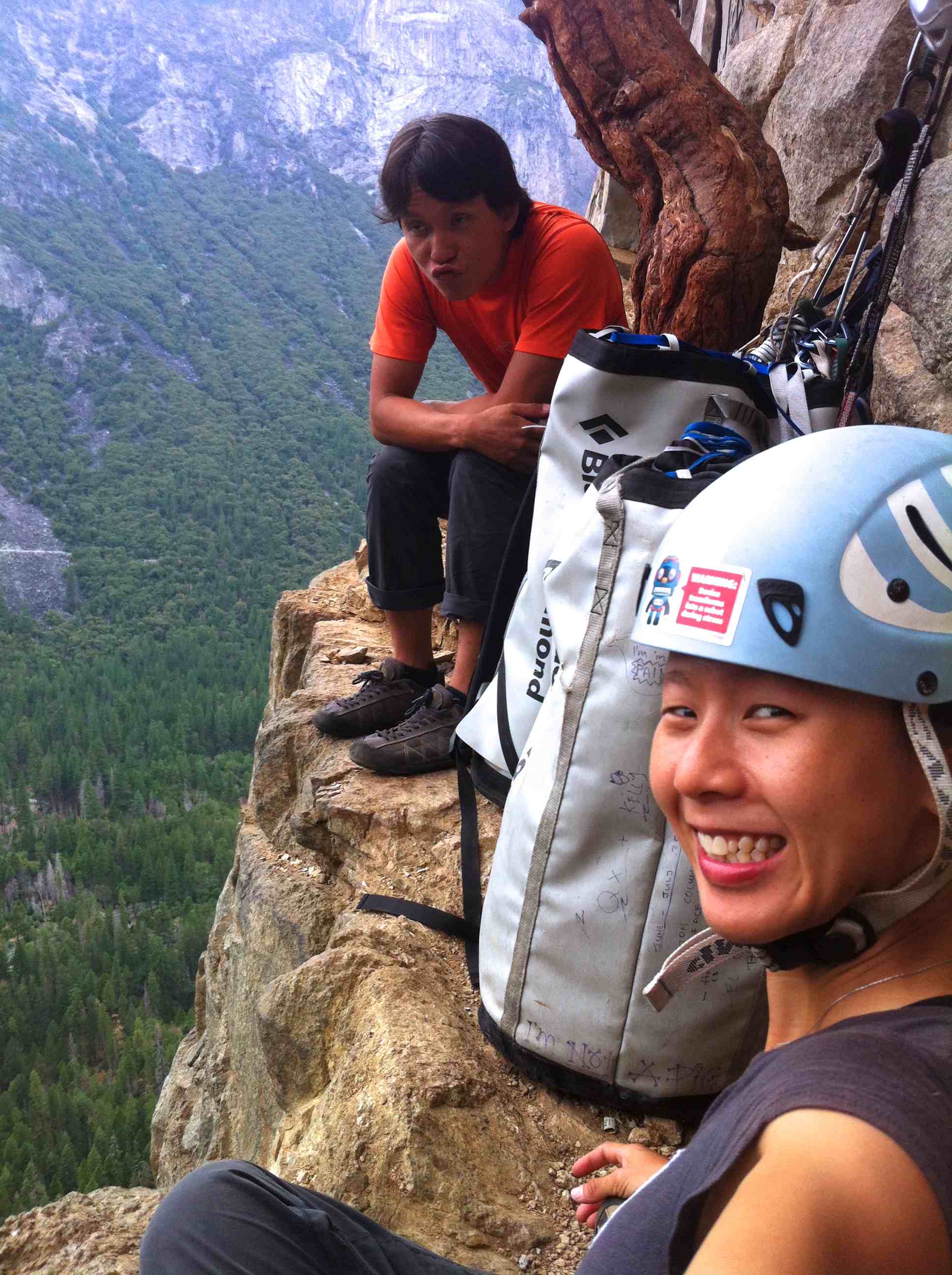 First day, we woke up at 5.30am at Patrick’s place in Fish camp, as usual we snooze for about 30mins because it was cold and its hard to get out of the sleeping bags. We had a huge breakfast and drove into the valley arriving at Bridalveil Fall car park at about 8am. We slowly packed our stuff and started the hike at 9am to the base, instead of taking 2 trips to hike loads to the base Kelly and I were feeling garang and took 2 huge haul bags with all water and equipment to the base in 1 trip. The bags were about 25kg each and we took many breaks to get the the bivy spot before the 4th class catwalk.