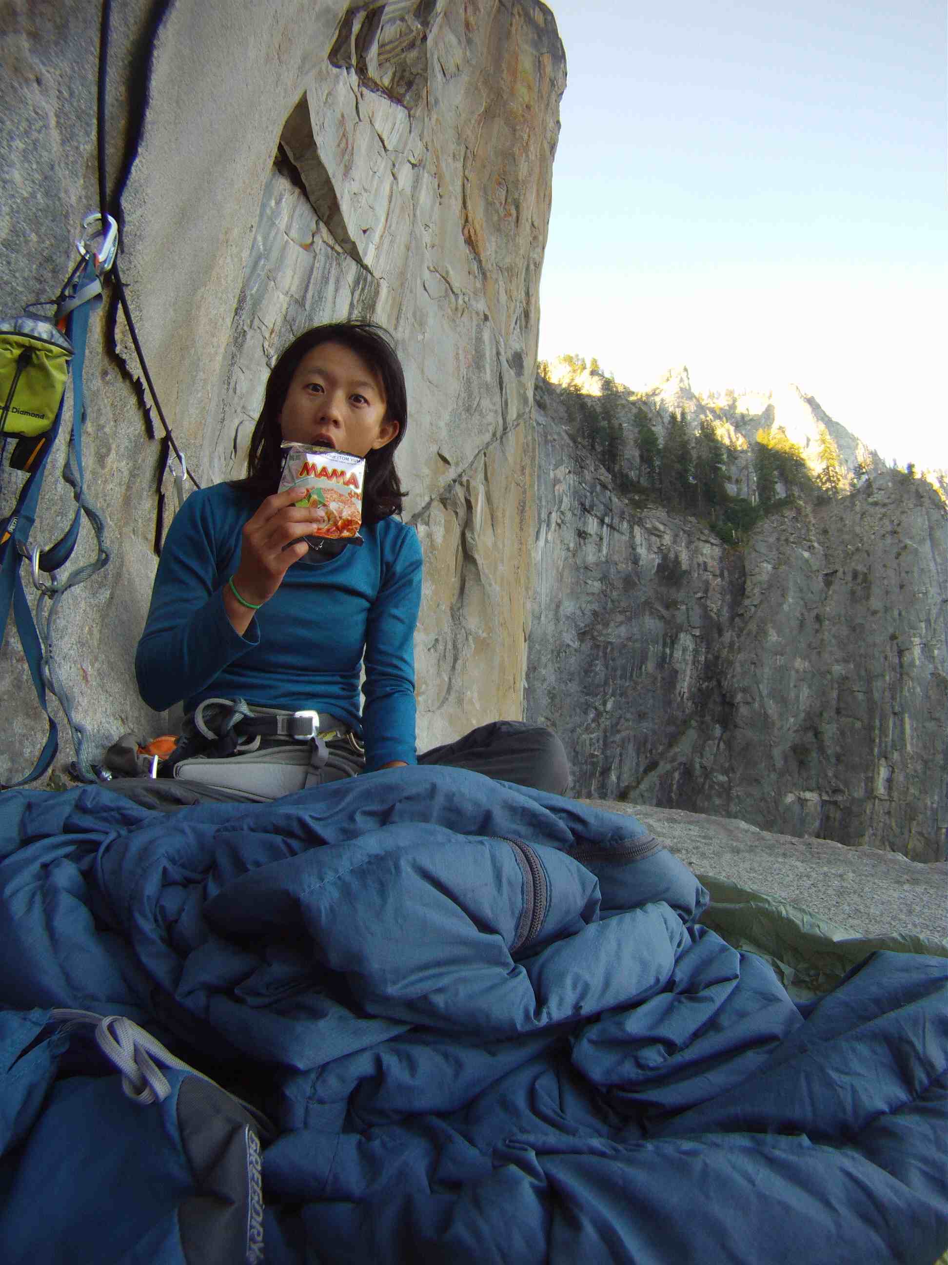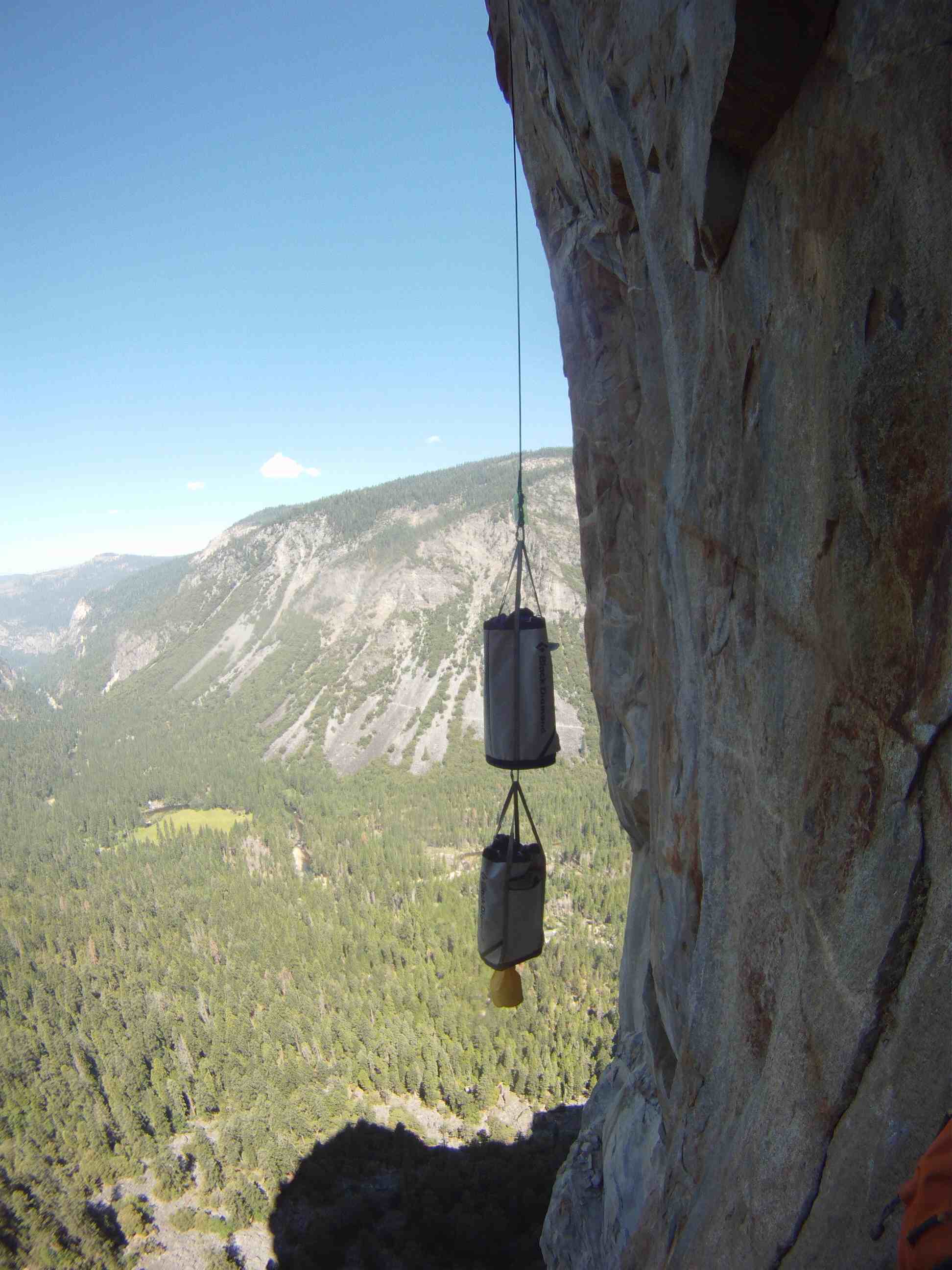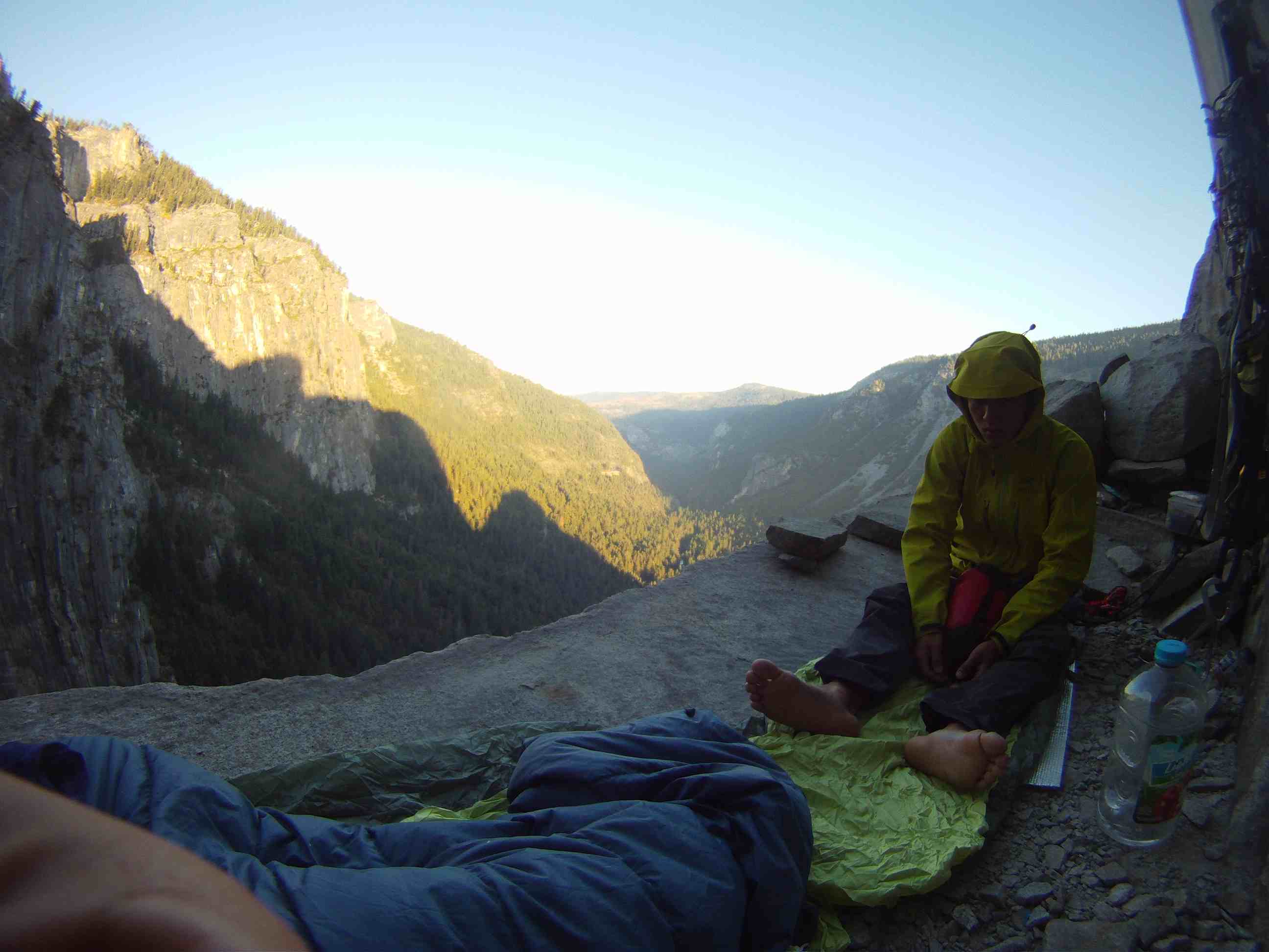 First day, we woke up at 5.30am at Patrick’s place in Fish camp, as usual we snooze for about 30mins because it was cold and its hard to get out of the sleeping bags. We had a huge breakfast and drove into the valley arriving at Bridalveil Fall car park at about 8am. We slowly packed our stuff and started the hike at 9am to the base, instead of taking 2 trips to hike loads to the base Kelly and I were feeling garang and took 2 huge haul bags with all water and equipment to the base in 1 trip. The bags were about 25kg each and we took many breaks to get the the bivy spot before the 4th class catwalk.