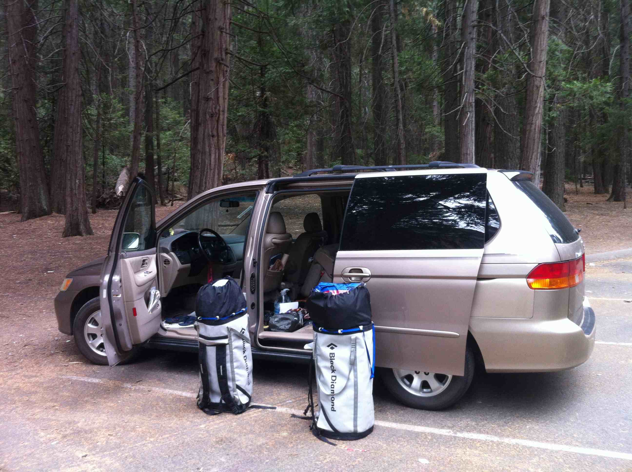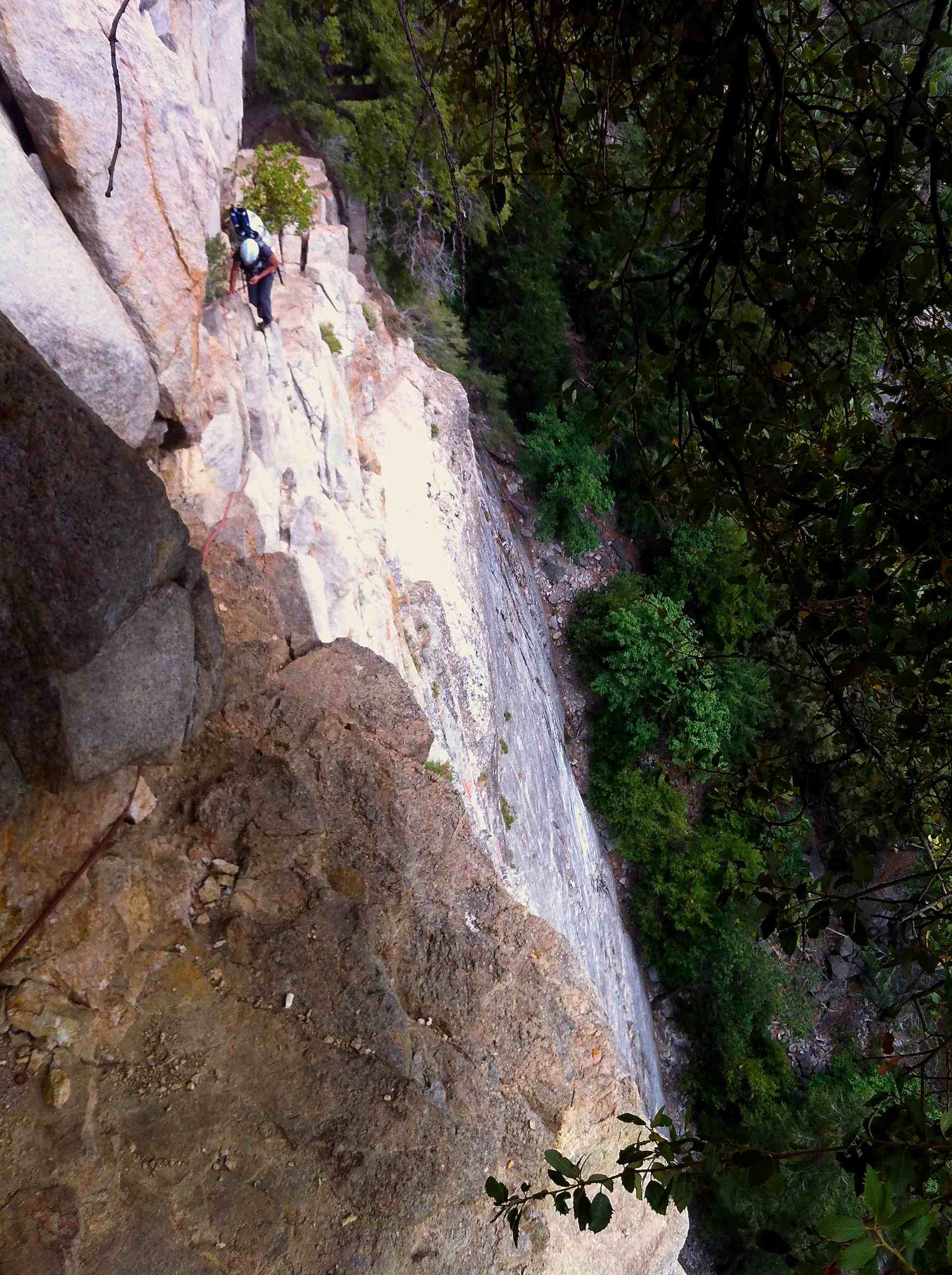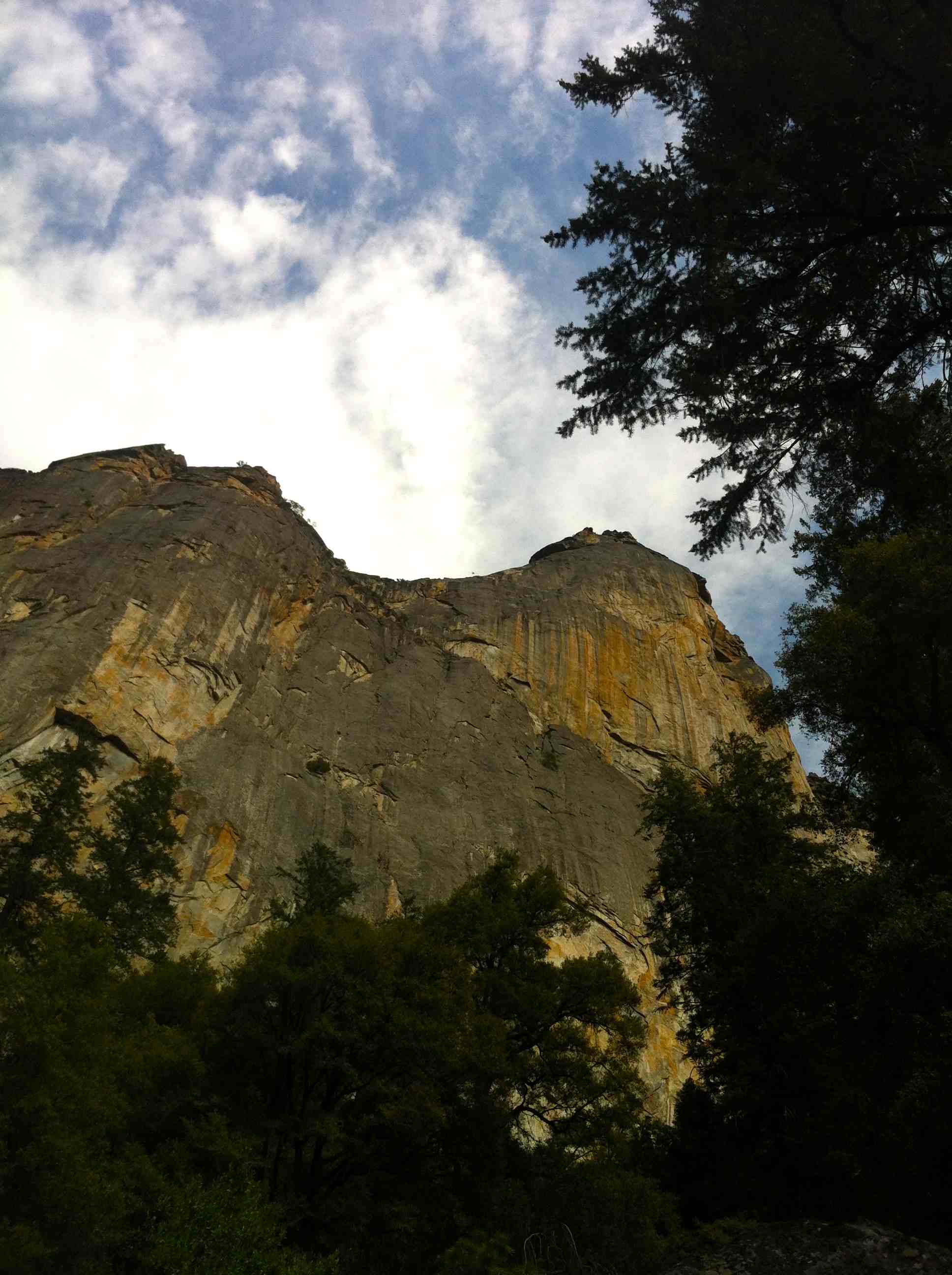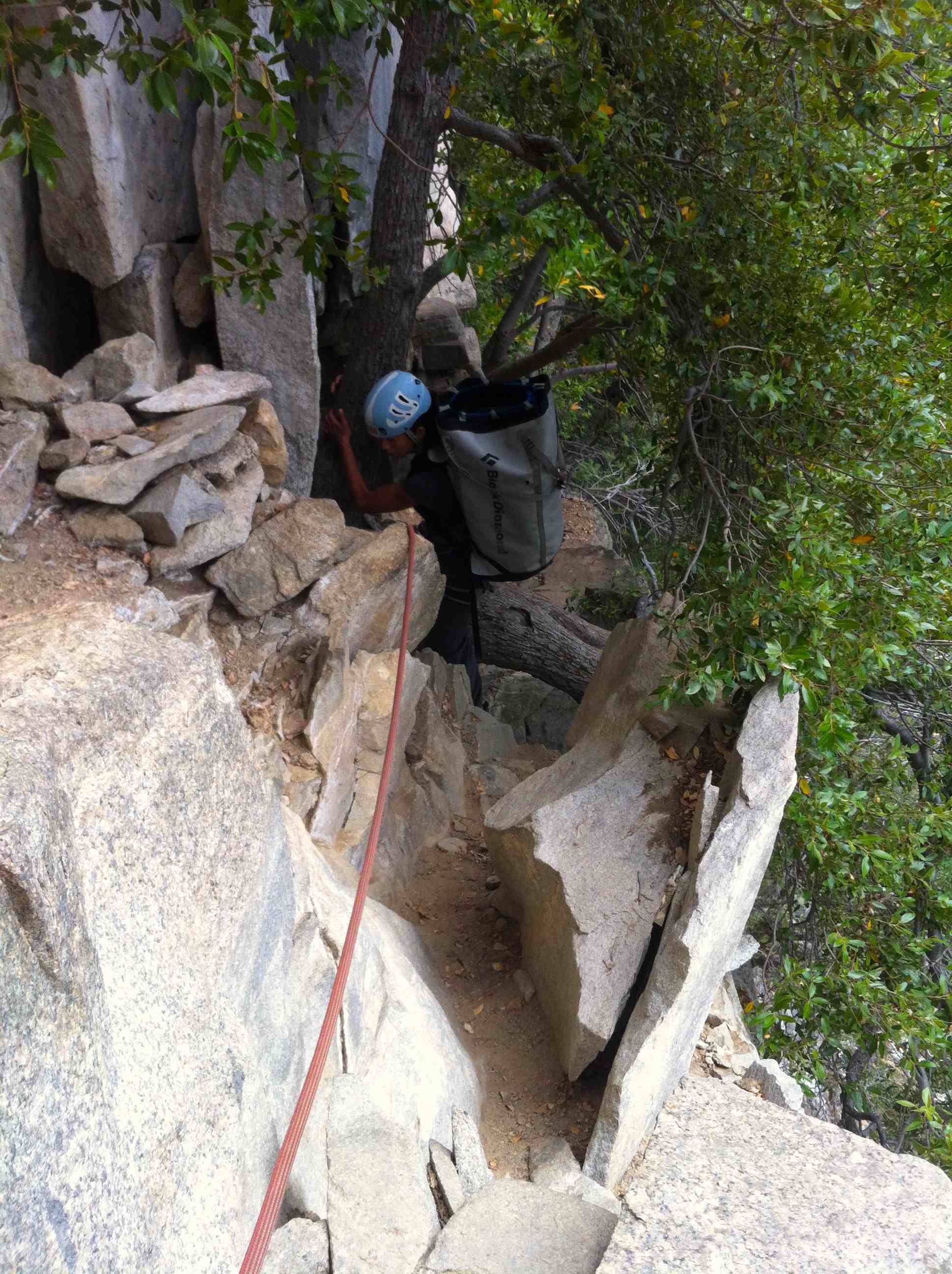 First day, we woke up at 5.30am at Patrick’s place in Fish camp, as usual we snooze for about 30mins because it was cold and its hard to get out of the sleeping bags. We had a huge breakfast and drove into the valley arriving at Bridalveil Fall car park at about 8am. We slowly packed our stuff and started the hike at 9am to the base, instead of taking 2 trips to hike loads to the base Kelly and I were feeling garang and took 2 huge haul bags with all water and equipment to the base in 1 trip. The bags were about 25kg each and we took many breaks to get the the bivy spot before the 4th class catwalk.