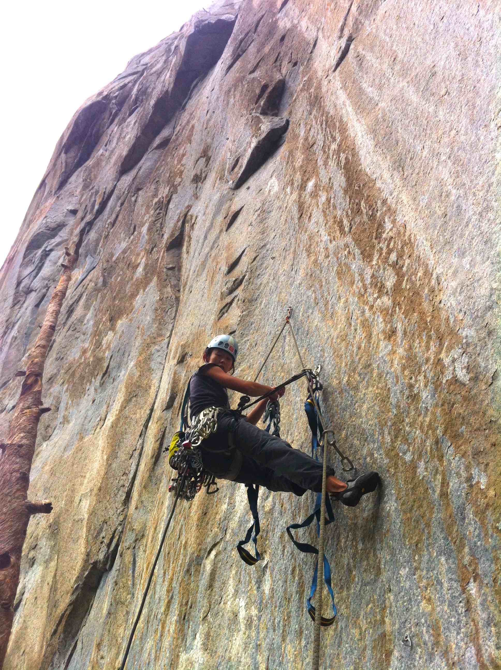Kelly gets the first 2 pitch of bolt ladders, it was her first aid lead and she’s not the tallest climber around. Even with her feet at the top step of the aiders, she was having problem before and during the C2F. Trashed her nice climbing shoes in the process, she backed off the pitch and got down upset. =(