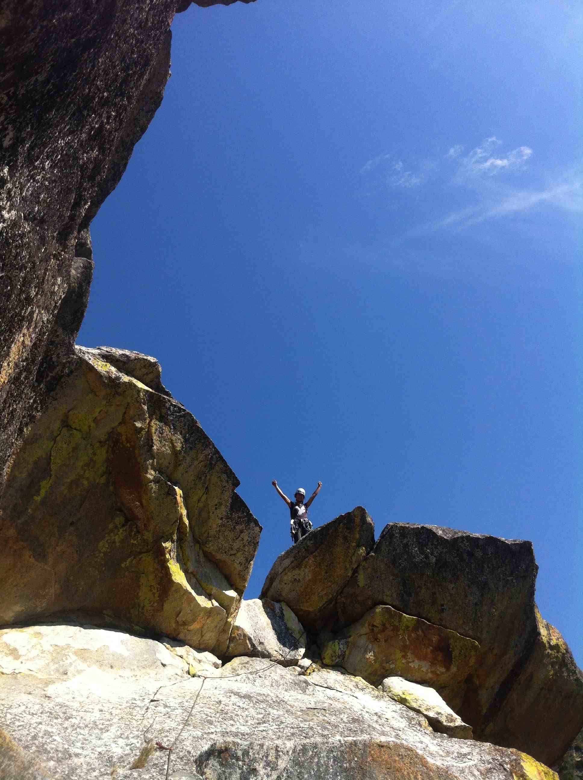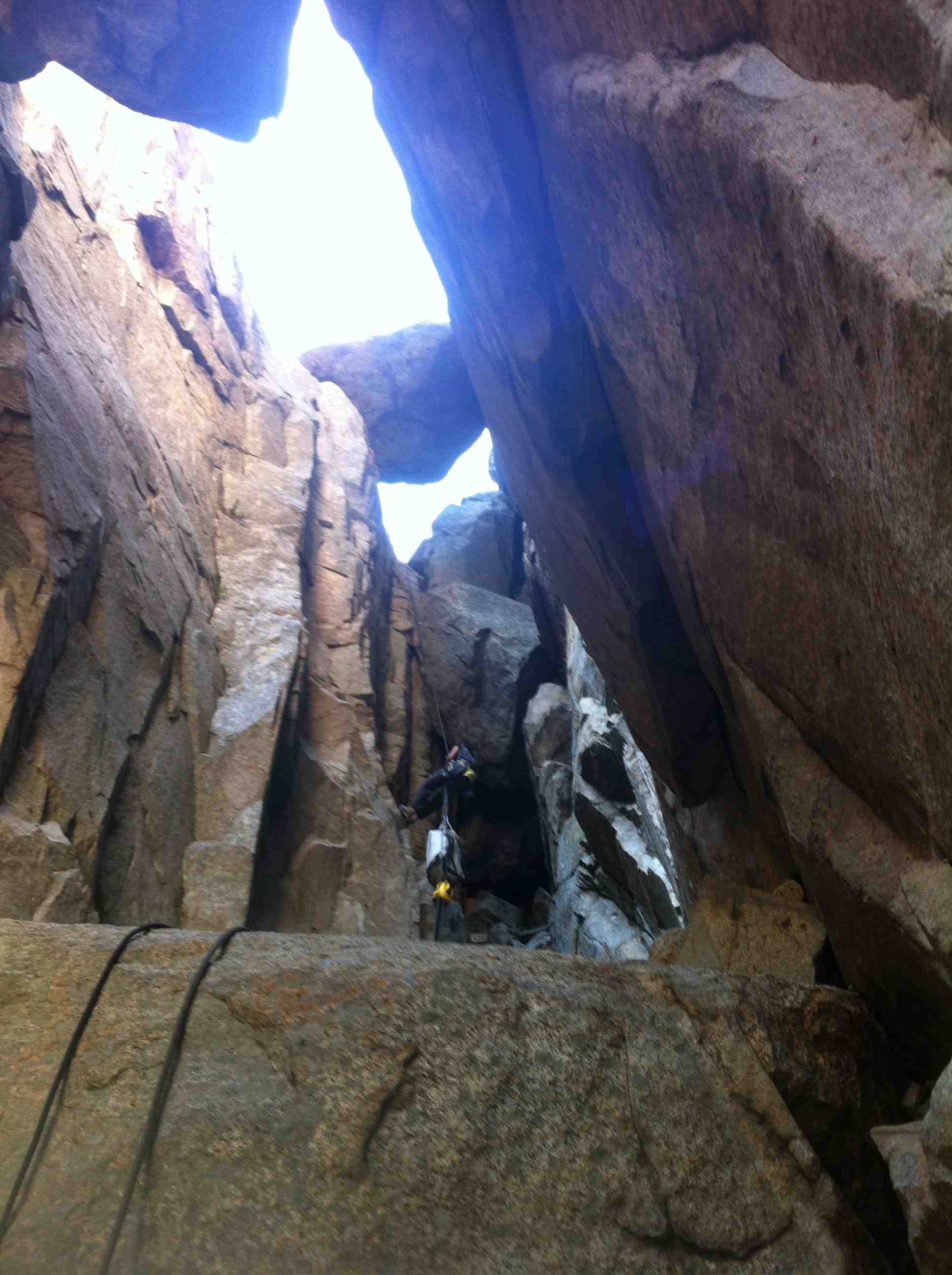 I climbed pitch 7 and linked 8 & 9 and climbed 10. Kelly took the summit pitch 11 and we topped out Leaning Tower via West Face at 4pm the following day. I shuttled the haul bags on pitch 11 and we make ourselves some coffee and Tuna with Mayo before the chimney descent.
