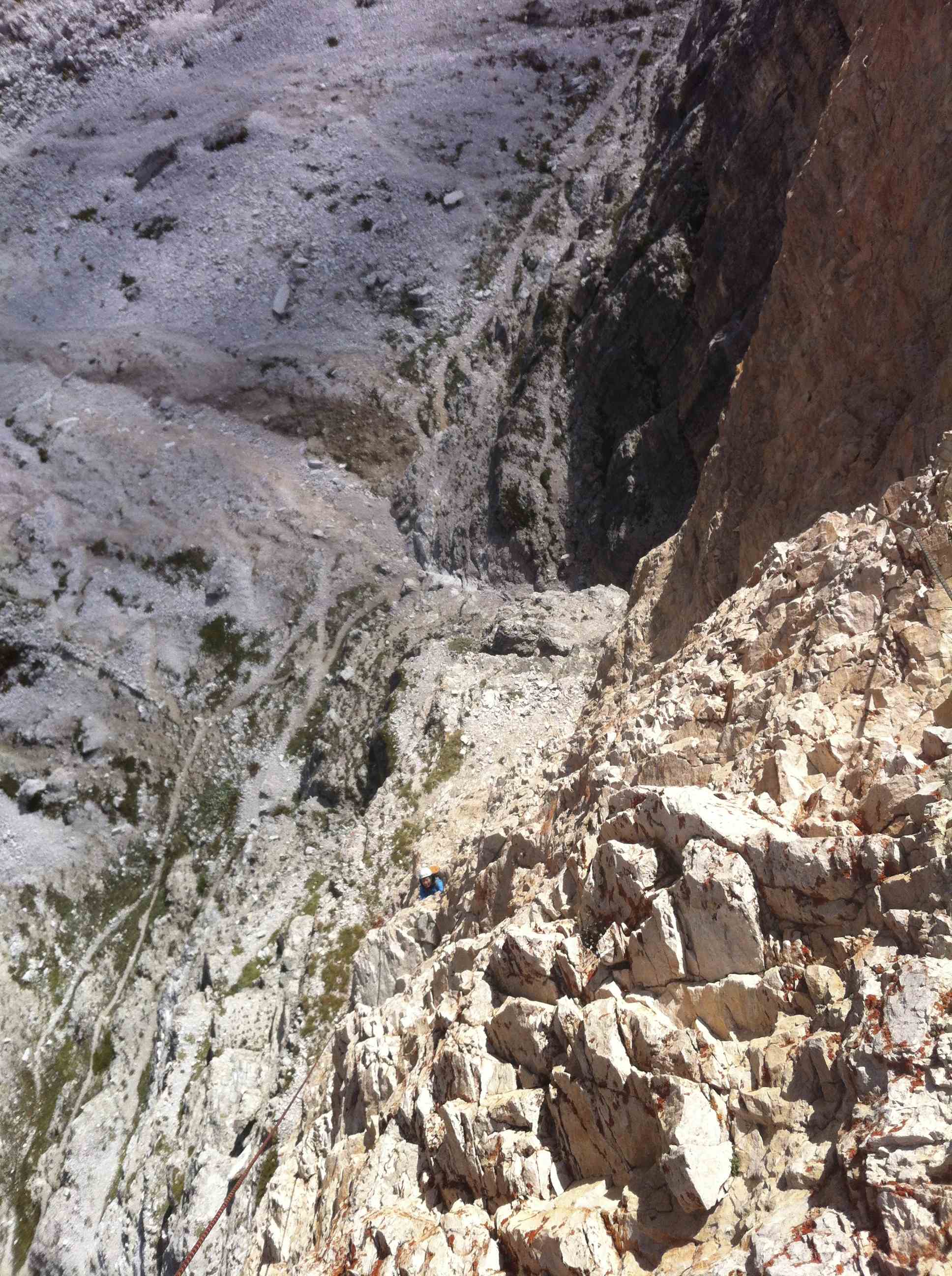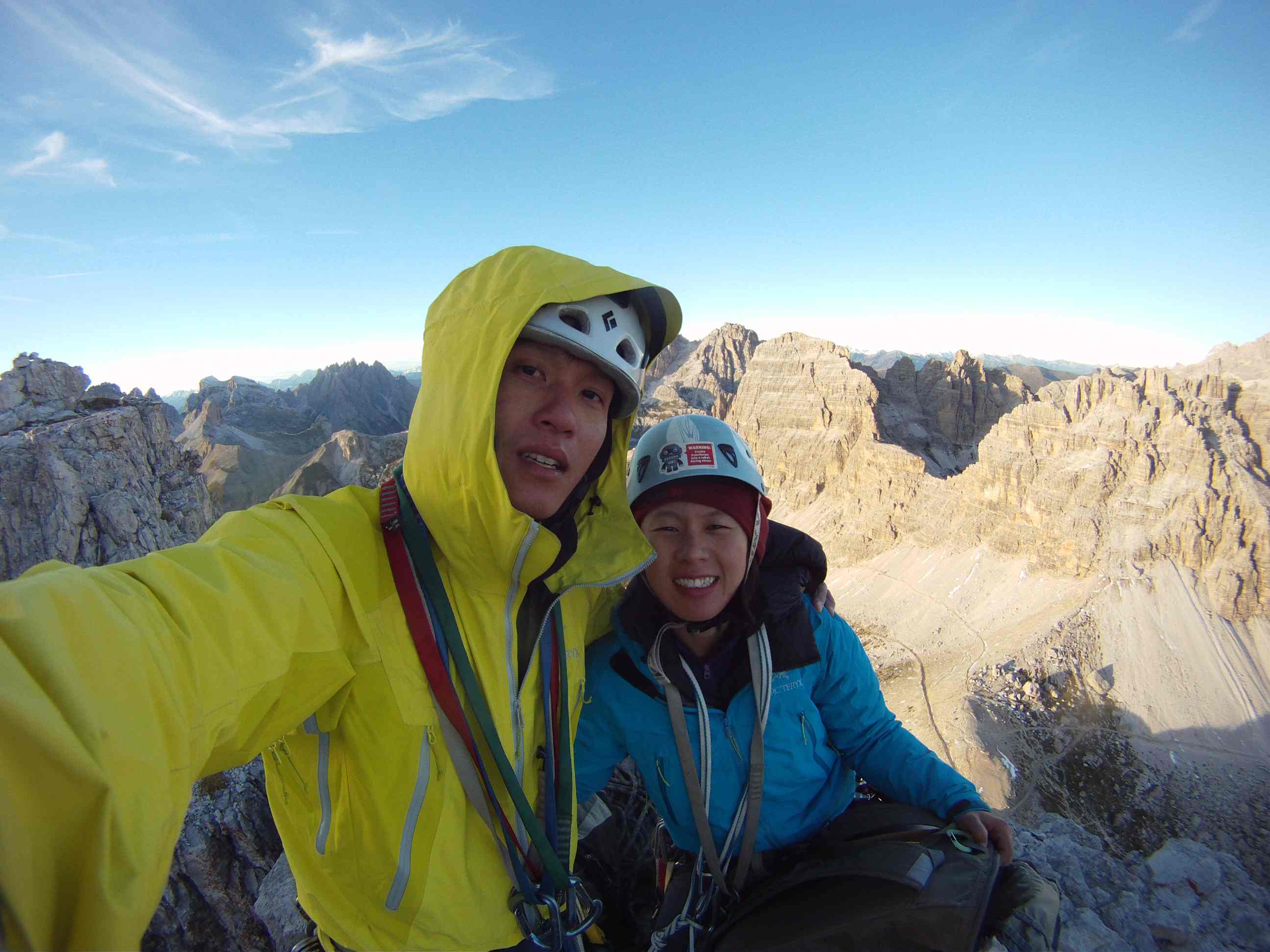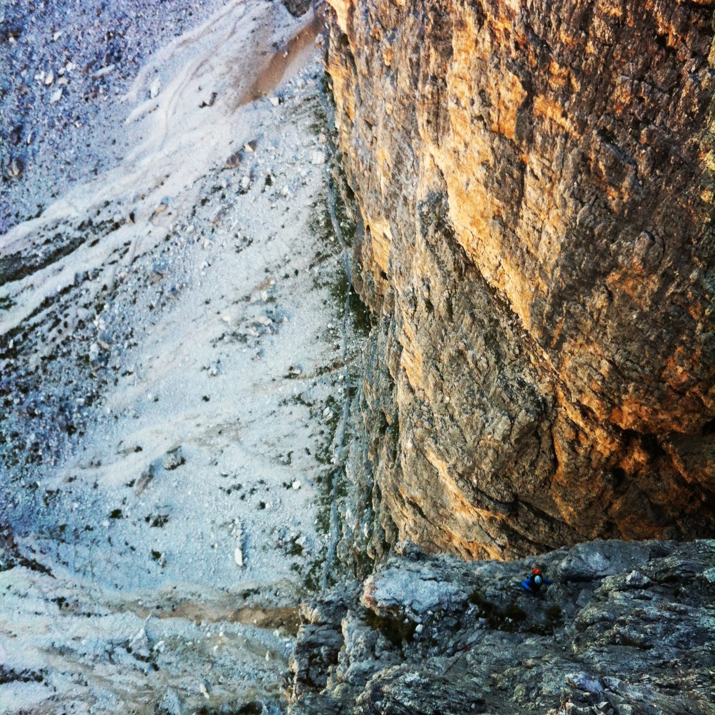So we got to the base and started the 12 pitch long day, not knowing how the classic Tre Cime climb is like we link P1 and P2 to a 3 piton belay which was kind of decent. But I have to say the amount of loose rocks i dislodge on the first 2 pitch almost killed my wife. It was not a good idea to kill my wife during our honeymoon. So P3 and 4 i took it easy and climbed it out in short pitches hoping for rock condition to be a little better. In Dolomite, there is no better rock condition, there is only less shitty rock condition and there is no crack to place gears in some pitches. You bascially have to climb it out and look for the ‘right’ pitons to clip into and hope that you are on the right route. However the ‘right’ pitons are everywhere, you will find 3 belays 5m apart and they are all not on the topo! I have to say by the time i was hanging off P4 I was starting to feel the adventure of the day is about to begin.