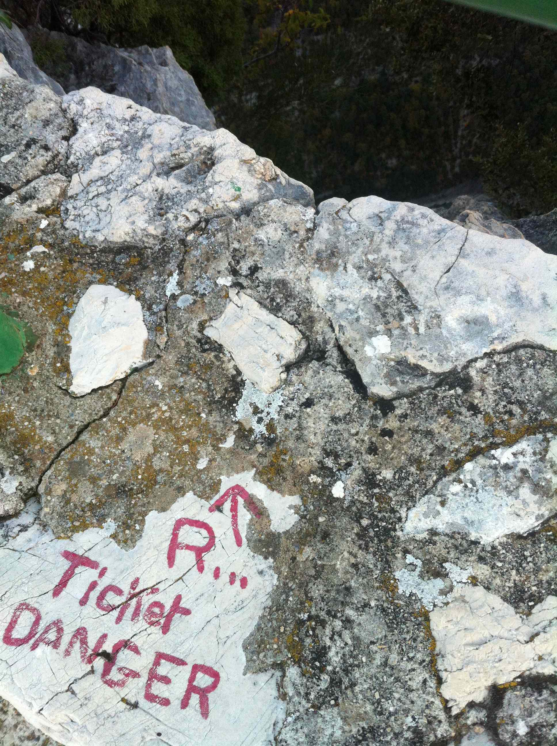 2 – bushwack northwards to Le Verdon, you should come to the GR 4 hiking route which is 14km long and you walk back to Sentier Martel or to Maline Chalet. Either way is not fun in climbing shoes and that is if you manage to bushwack to the trail. Sometimes you find a sharp drop off which could be another crag or just choss. Did we mention hitch hike back to your car?