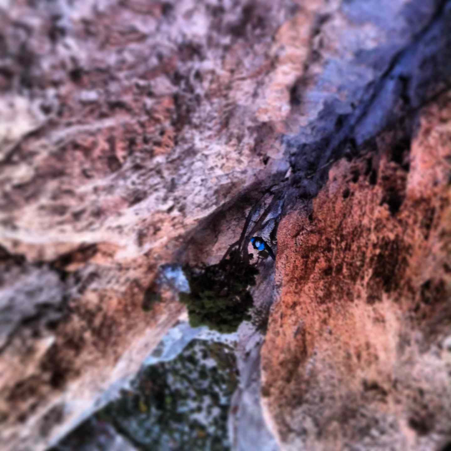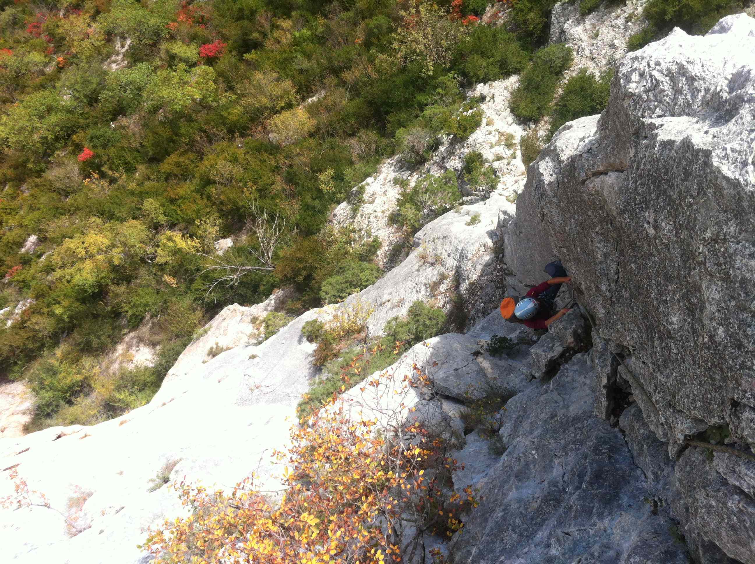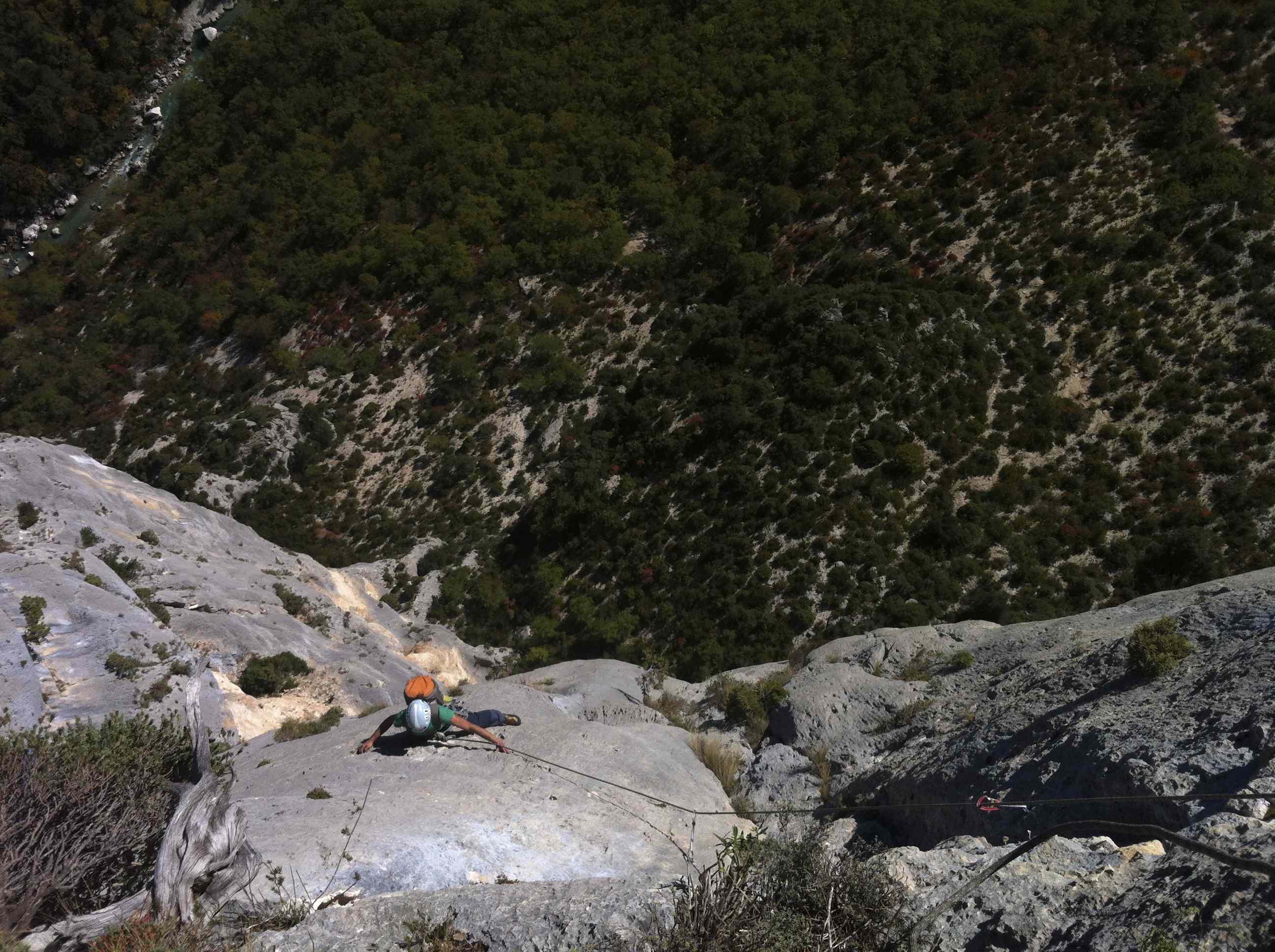 We found the base of Pichenibule with some bushwacking and with the help of some stray cords on a plant on the route. As we were already kinda late from the usual snooze monster in the morning and the longer than expected breakfast we take, I took the first lead on the traversing 5c pitch which feels a little like Tre Cime with some loose stuff here and there. Kelly took the second traverse + down climb and got to the belay alright. It all seems good and fast until I hit the long 6a dihedral 3rd pitch. There seems to be 2 way up, a newly bolted dihedral on the left and some old bolts on the right. I thought to myself ” ah great! new bolts ! It should be some bolts replacement program to make this mega classic safer.” So off I went and shot off to the left and climb it out on the strenuous dihedral until a point where you have to top out on a small ledge with little or no hand holds. I was thinking ” Hell, old school Verdon 6a is hard !” Sweaty palms, 3m runout below me and rock humping action, I barely make it up that ledge and staring at me is a traversing face with some raindrop holds and clean grey wall. I’m doubting that I’m on the wrong route and just keep telling myself 6a can’t be that hard and started to blast up that grey traverse.