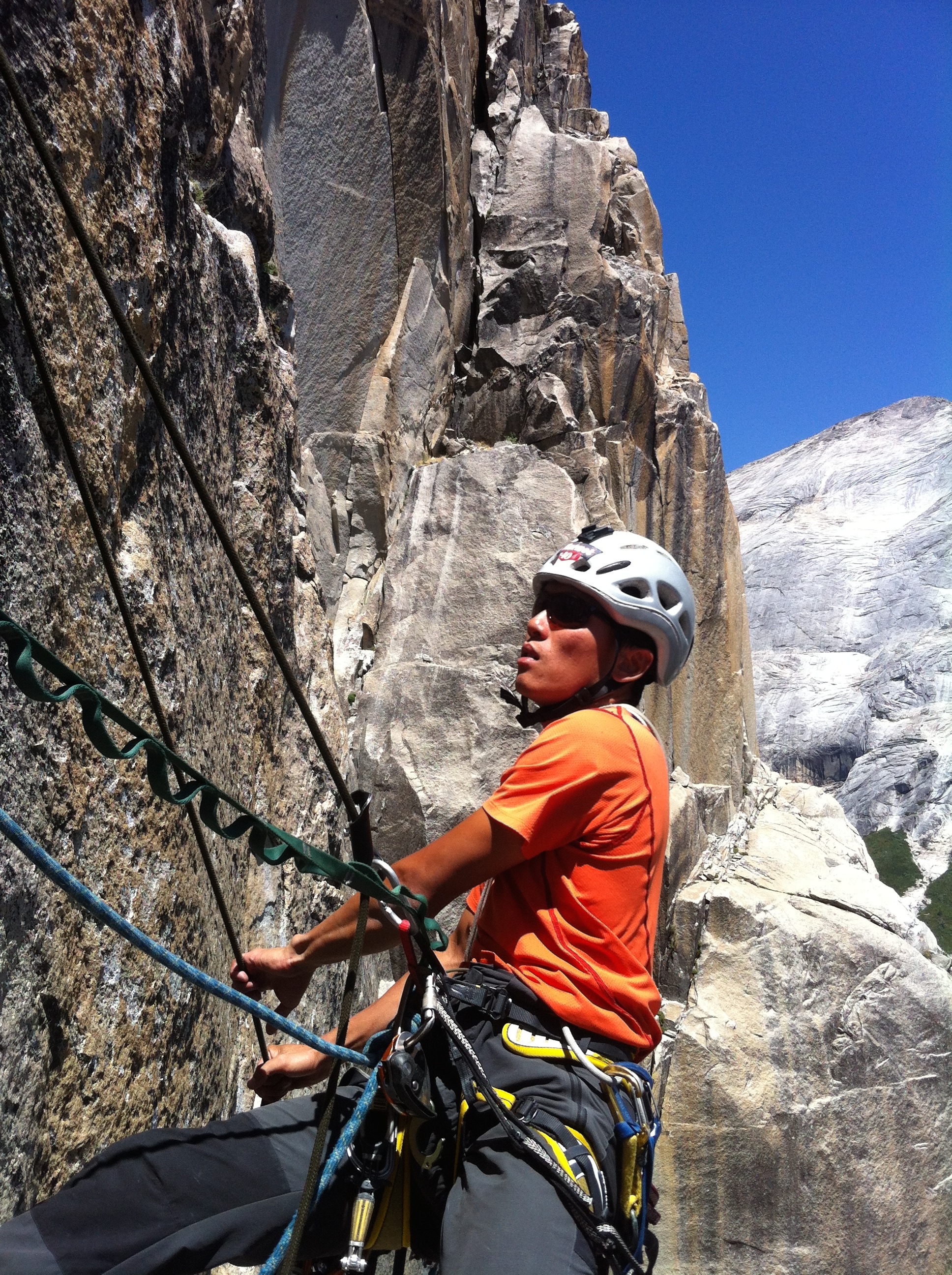 3 hrs on the fixed ropes to get to the nice bivy spot at the base. Time was 7pm and we hung around drank water rested a little and head off to the base of the climb. At this point of time the guidebook had a huge error with a pitch to the pendulum and the 5.11d variation starts right off the ground. It’s actually 250 ft of climbing to the pendulum anchors and 2 raps to the ledge. There is also a old leaper bolt in the middle of the first rap which you will need to clip in order to stay tensioned on the rope to get to the next anchor. We took much longer than expected and was on the wall without headlamps until 10pm. Kelly wasn’t pleased about that, however we have to full moonlight as our headlamps! Super beautiful and bright night!