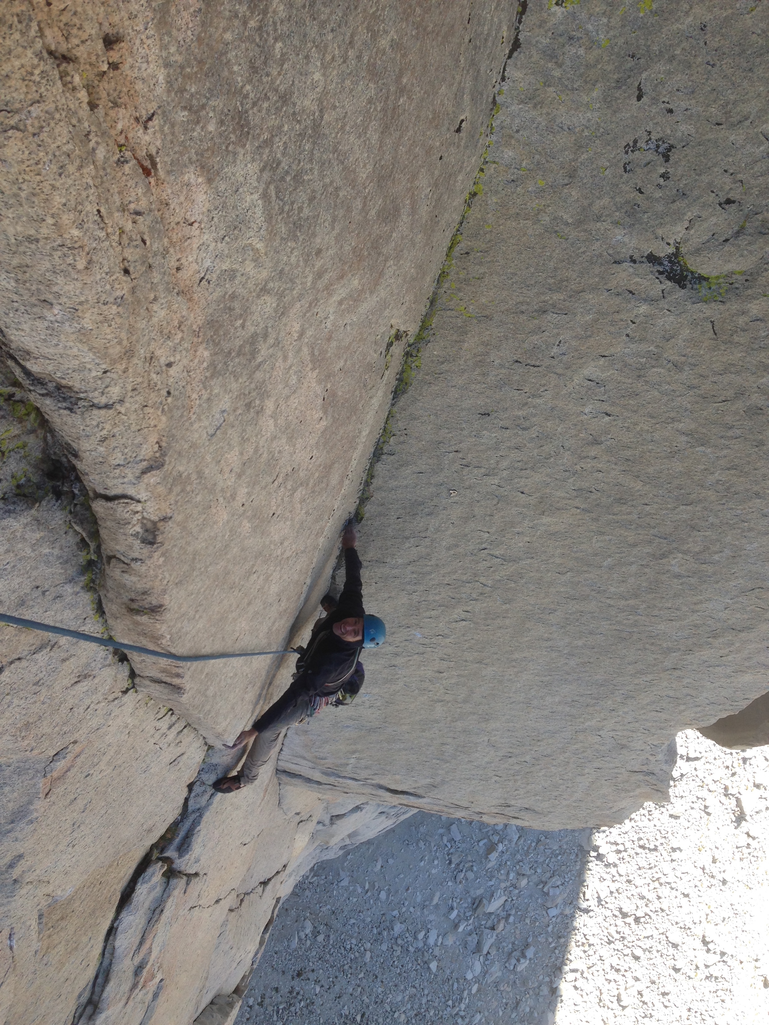 At this point of time, the objective is right in front of you and the size of the rock is just amazing. With many routes going up the wall, we chose something which is in between, not super easy like the Red Dihedral, 10b or something crazy hard like the Venturi Effect, 12+. The Sunspot Dihedral is a long sustain climb with 3 pitches of 5.11 back to back and the crux pitch is a 11b face climb protected by bolts.